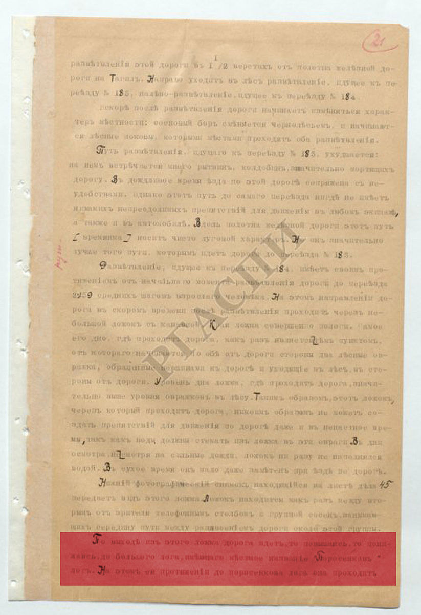 Документы предварительного следствия, произведенного судебным следователем по особо важным делам Н.А. Соколовым по делу об убийстве императора Николая II, членов его семьи и приближенных (Том № 5). РГАСПИ. Ф. 588. Оп. 3. Д. 8 «В расстоянии 414 шагов от переезда на полотне дороги в наиболее низком по уровню дороги месте, набросан мостик. Он состоит из нескольких сосновых бревешек, толщиной вершка в 3-4, и старых железнодорожных шпал. Шпалы и бревешки положены прямо на полотно дороги».