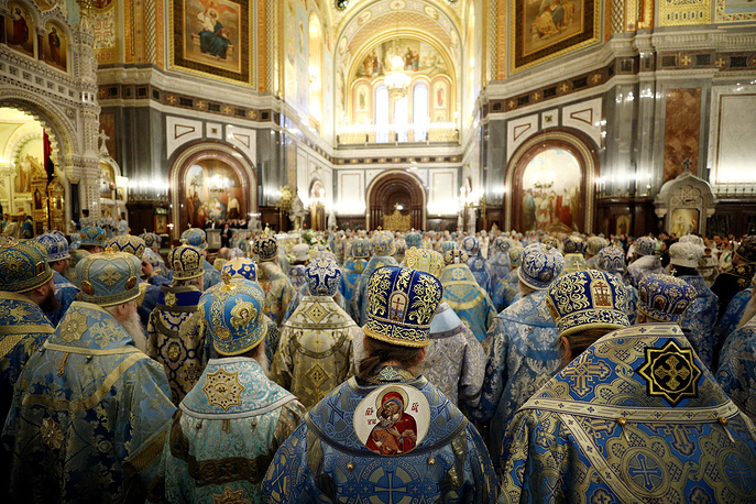 На телеканалах «Союз» и «Спас» шла прямая трансляция богослужения.