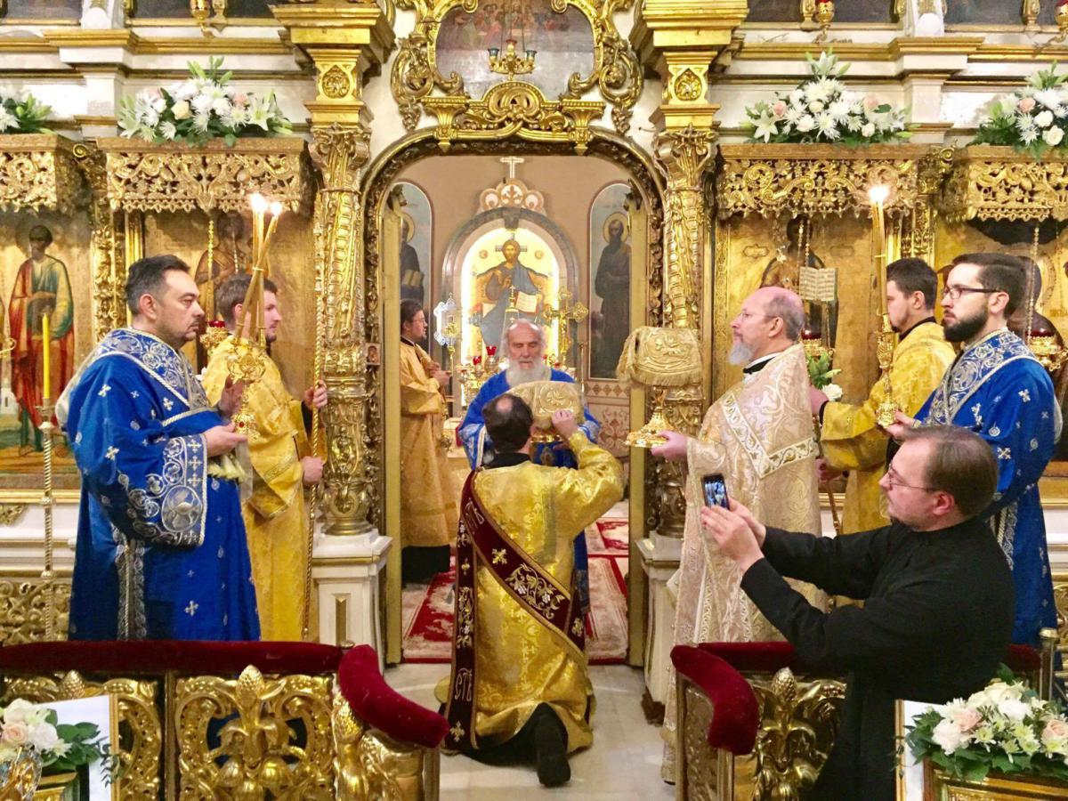 Током посете Руској Праволавној Цркви поводом обележавања стогодишњице почетка Сверуског Помесног Сабора (1917-1918.) и васпостављења Патријаршије у Руској Православној Цркви, Његова Светост Патријарх српски г. Иринеј началствовао је 3. децембра 2017. године светом Литургијом у храму Светих апостола Петра и Павла на Подворју Српске Православне Цркве у Москви.