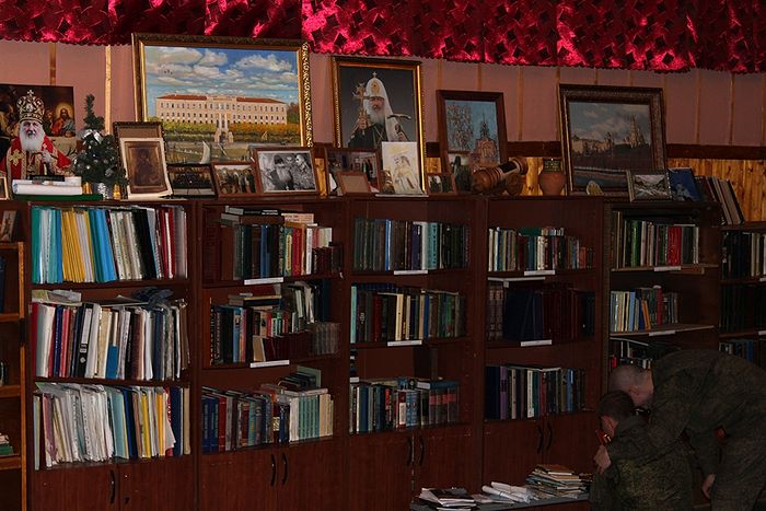 С учетом особенностей движения по столичным дорогам, выехали из Москвы задолго до времени встречи. Поэтому прибыли в поселок Инженерный в назначенный час. В ожидании отца Варнавы успели даже немного погулять и оценить красоты местного пейзажа. Батюшка сам вышел к нам навстречу и сразу повел в воинский клуб. Неожиданно попав в деятельную творческую атмосферу, пытаюсь сначала понять происходящее: в одной части здания идет репетиция хора, в другой – солдаты трудятся над написанием икон. У стендов с книгами православной литературы толпятся военнослужащие и что-то увлеченно обсуждают.