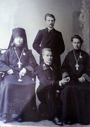 Студент Казанской духовной академии Н.С. Ряшенцев (священномученик Герман) с ее выпускниками. Фото из архива игумена Варнавы (Столбикова) – Не так давно мы с хором ездили в Казань и пели в Казанском соборе, где наверняка владыки Герман и Варлаам бывали. В архиве Казанской духовной академии мне удалось познакомиться со статьями владыки Германа. Знаю, что сохранились и диссертации владык Германа и Варлаама. Просто надо приложить усилия и исследовать этот вопрос…
