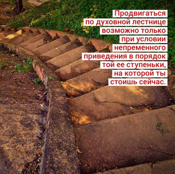 Конец такому путешествию в глубины собственного сердца наступает лишь вместе с окончанием земной жизни человека и его вхождением в вечность. Но продвигаться по этой духовной лестнице возможно только при условии непременного приведения в порядок той ее ступеньки, на которой ты стоишь сейчас. Любая попытка перепрыгнуть сразу же через несколько ступенек чревата непредсказуемыми последствиями. Преподобный Серафим Саровский говорил об этом так: «Все делай потихоньку, полегоньку, не сразу, не вдруг. Добродетель — не груша. Ее сразу не съешь!».