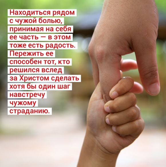 Находиться рядом с чужой болью, уметь переживать эту боль, принимая на себя ее часть — во всем этом, как ни странно, тоже есть радость. Но пережить ее способен лишь тот, кто решился вслед за Христом сделать хотя бы один шаг навстречу чужому страданию. Этот шаг может быть совсем маленьким, но именно он отличает христианскую радость от всех прочих ее проявлений. Наш современник, преподобный Паисий Святогорец говорил об этом так: