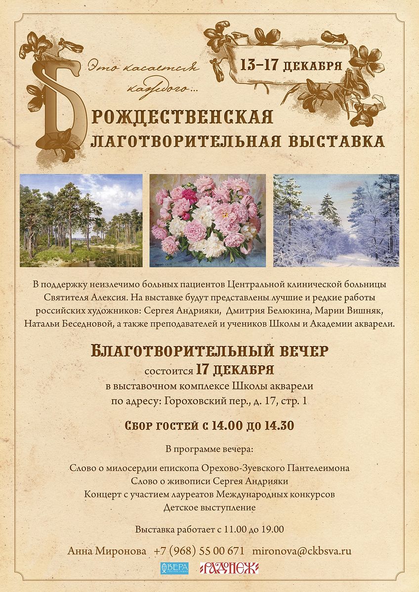 13-17 декабря в Школе акварели Сергея Андрияки состоится Вторая Рождественская Благотворительная выставка "Это касается каждого" в поддержку неизлечимо больных пациентов Центральной клинической больницы Святителя Алексия. В преддверии Рождественских и Новогодних праздников можно будет приобрести лучшие и редкие картины российских художников в качестве оригинальных подарков родным и близким. И вместе с тем, сделать большое доброе дело — все средства, полученные от продажи картин, будут направлены на поддержку тяжелобольных пациентов паллиативного отделения больницы свт. Алексия.
