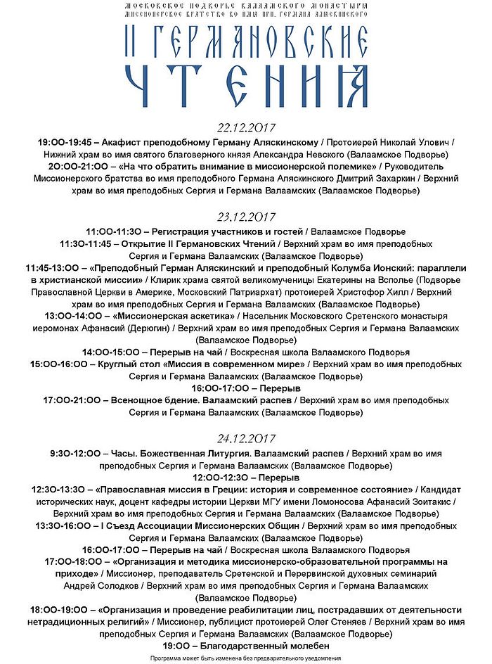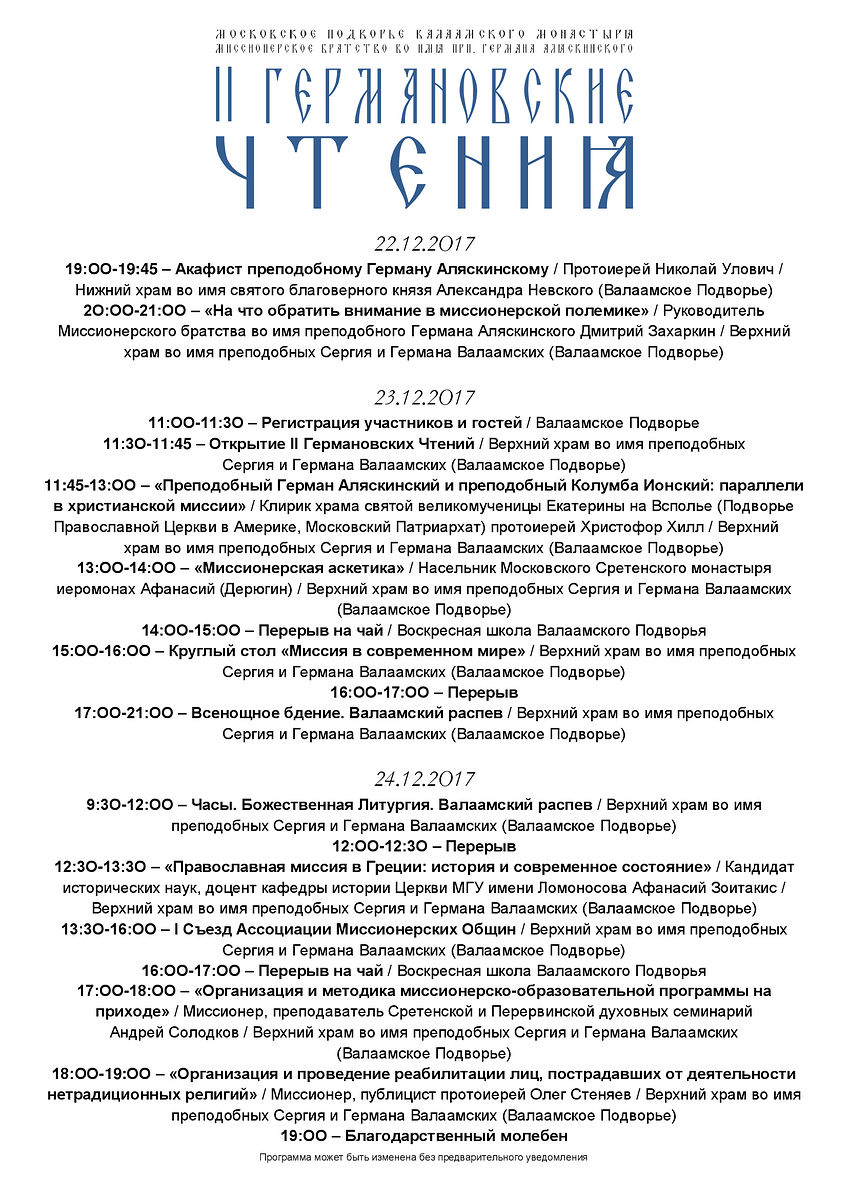 Опубликована программа II ГЕРМАНОВСКИХ ЧТЕНИЙ, которые состоятся 22-24 декабря 2017 года. ЧТЕНИЯ пройдут на Московском Подворье Валаамского монастыря (2-я Тверская-Ямская, 52) и обещают стать одним из главных миссионерских событий года. В рамках II ГЕРМАНОВСКИХ ЧТЕНИЙ состоятся: лекции и беседы миссионеров, круглый стол о современной миссии, I СЪЕЗД МИССИОНЕРСКИХ ОБЩИН.