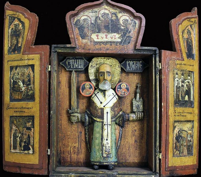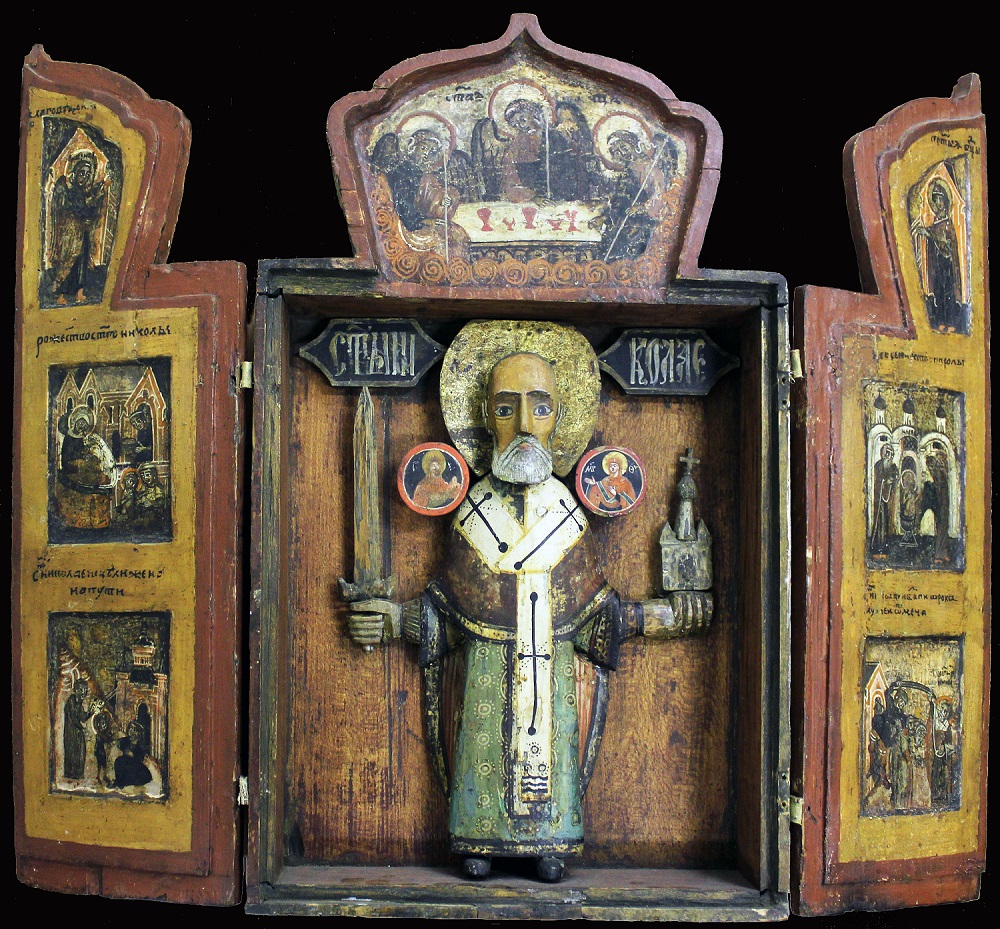 Одним из главных экспонатов выставки будет также трехстворчатый складень с объемным изображением святителя Николая Мирликийского, выполненный северным мастером в первой половине XVIII века, представляющий собой яркий пример сочетания деревянной скульптуры и живописи в русском церковном искусстве. Его центральная часть завершается живописным изображением Троицы Ветхозаветной, на боковых створках помещены четыре клейма со сценами жития святителя и композиция Благовещения. Святитель Николай изображен в рост, в епископских одеждах, с мечом и градом в руках. Складень исполнен с сохранением древнерусской традиции, что характерно для северных земель.