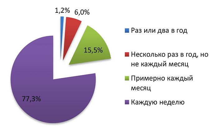 Обращает внимание и довольно высокий уровень воцерковленности прихожан: почти 77% опрошенных посещают храм каждую неделю, из них причащаются каждую неделю или раз в месяц 52% прихожан, регулярно читают Евангелие (8,9%) и другие положенные тексты 38,8%.