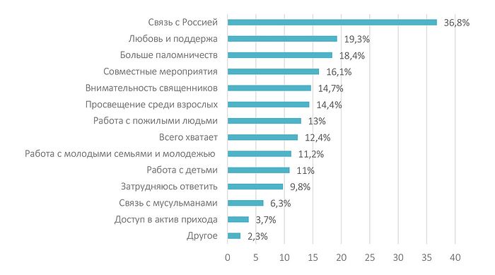 Наименее актуальными для прихожан, остающимися вне поля их интереса оказались возможность доступа в актив прихода (всего 3,7%) и необходимость совместных мероприятий с мусульманами и мусульманскими общинами (6,3%). Как показал опрос, в этом православные верующие нуждаются меньше всего.