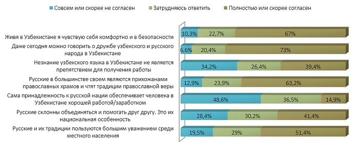 О последнем свидетельствует и тот факт, что 67% прихожан отметили: живя в Узбекистане, они чувствуют себя комфортно и в безопасности; а 73% уверены, что даже сегодня (когда нет СССР) можно говорить о дружбе узбекского и русского народов в Узбекистане. Не актуализирована и такая проблема, как то, что именно незнание узбекского языка является препятствием для получения работы, – данные свидетельствуют, что в обществе нет однозначно имеющегося опыта по этому вопросу. При этом и сама принадлежность к русской нации не обеспечивает сегодня человека работой в Узбекистане, очевидно, этому способствуют иные факторы. Вместе с тем до сих пор русские и их традиции пользуются большим уважением местного населения – так считают 51,4% опрошенных. Все перечисленное, на наш взгляд, указывает на то, что этнический фактор – принадлежность к русским – значим лишь в определенных сферах, чаще всего при межличностном общении, как память о том, что в свое время дали русские Узбекистану.