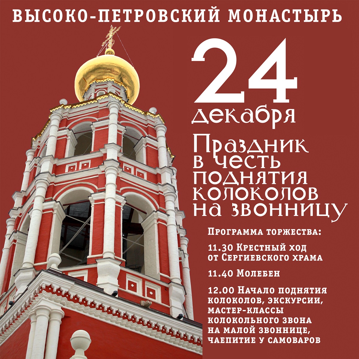 В праздничный день после воскресной Литургии от Сергиевского храма ко Святым вратам пройдет Крестный ход. Здесь будет совершен молебен, после которого начнется поднятие колоколов. Гости монастыря тем временем смогут согреться монастырским чаем из дровяных самоваров, попробовать знаменитые «Петровские» пирожки, поучаствовать в мастер-классе колокольного звона и попробовать свои силы на малой звоннице.