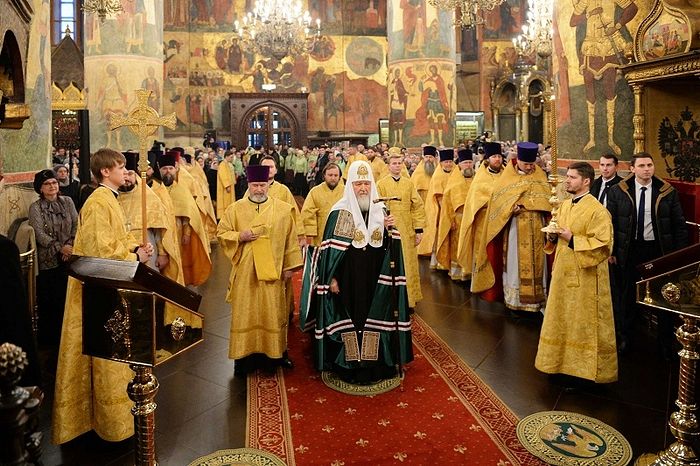 Предстоятель Русской Православной Церкви совершал богослужение в облачениях, созданных по древнему иконописному образцу облачений святителя Петра, и с копией посоха святителя, хранящегося в Успенском соборе Кремля.