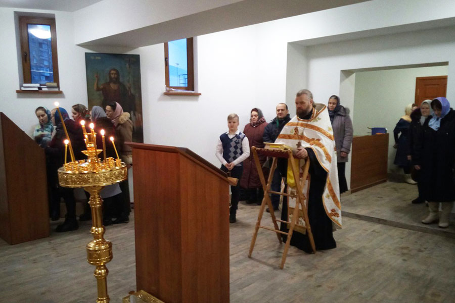 Первая служба состоялась 5 января 2018 года – в обустроенном цокольном этаже настоятель протоиерей Александр Пеканов и прихожане собрались на Царские часы.