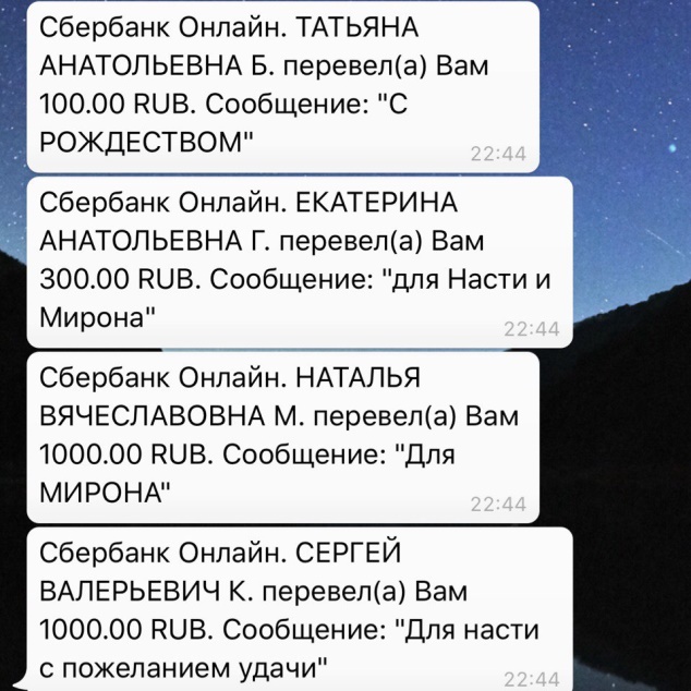 Каждый перевод сопровождался теплыми словами от отправителя. В преддверии Рождества Христова Насте и ее сыну желали здоровья и счастья, поздравляли с Праздником.