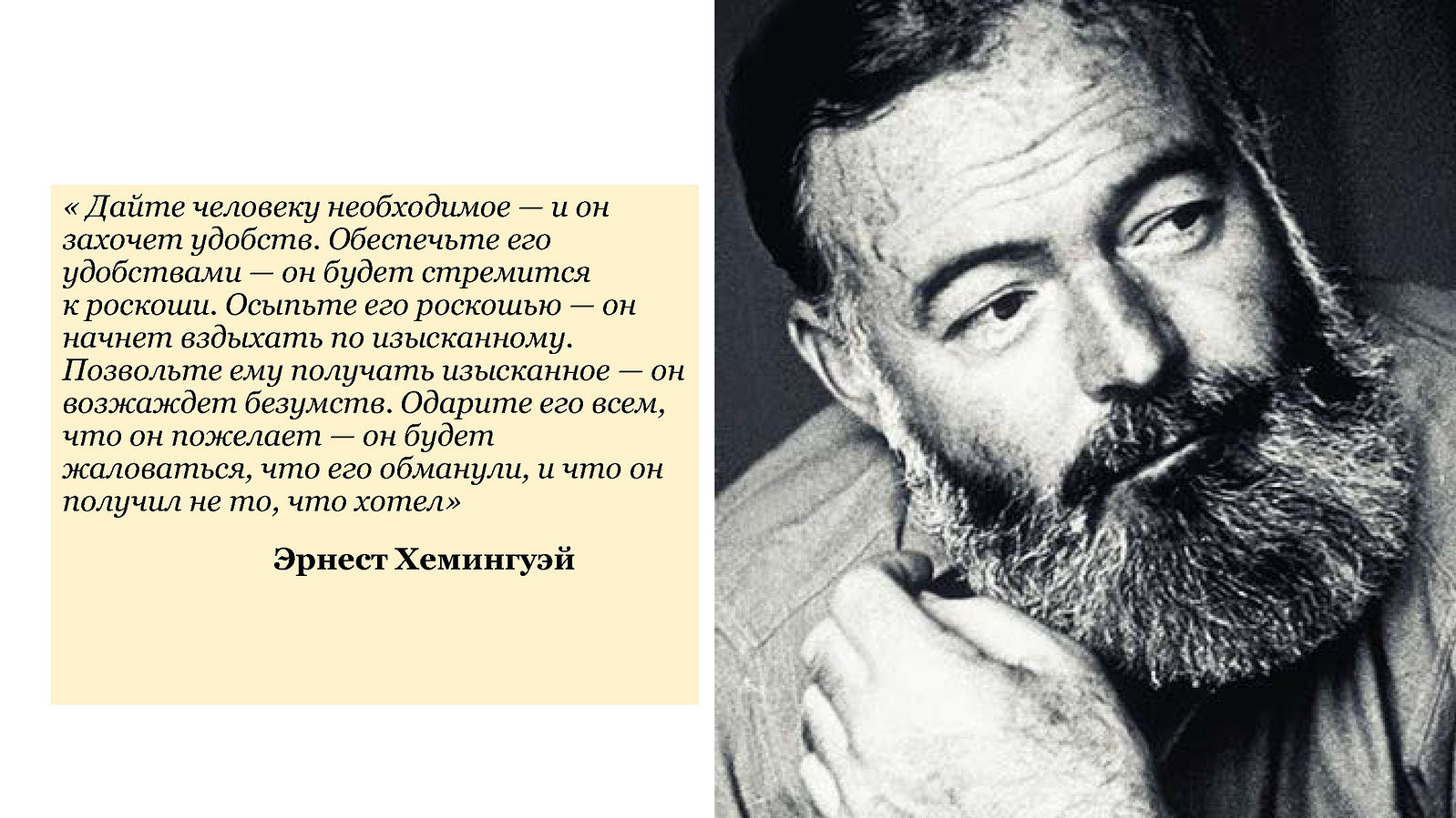 Нравственность, основанная на потреблении, существовать не может, потому что человека нельзя до конца удовлетворить. И тут хотелось бы процитировать еще одного известного человека – писателя Эрнеста Хемингуэя. Он сказал о материальных потребностях одну, на мой взгляд, глубоко психологичную вещь, подтверждение которой мы можем легко увидеть у нас в сердце: