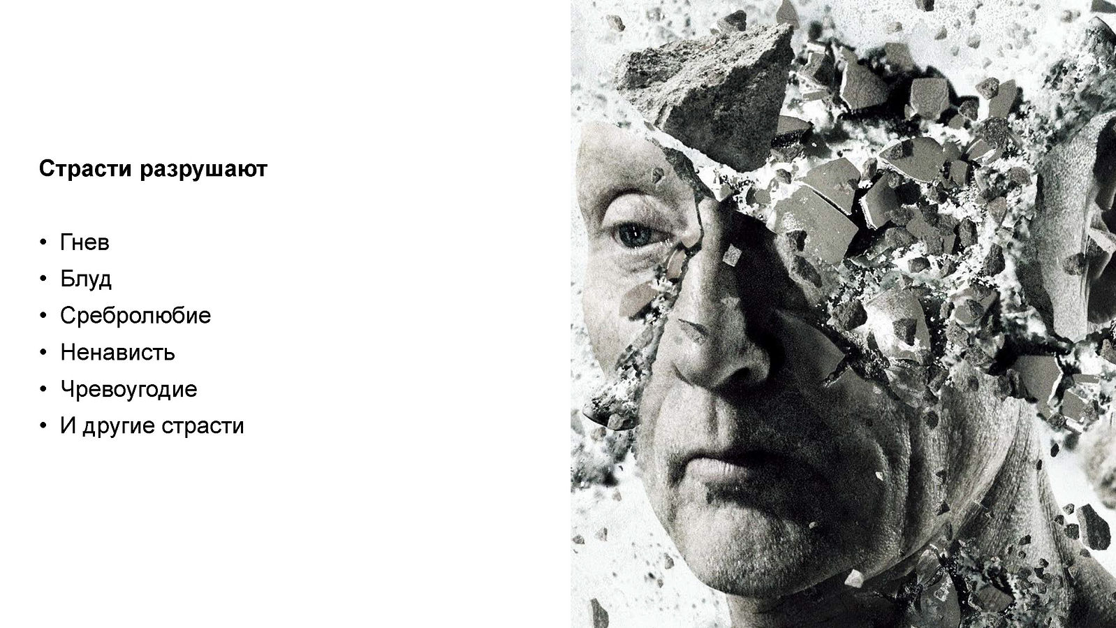 Думаю, никто не будет спорить, что к разрушению человека – внутреннему разрушению – порой приводит гнев. И все прекрасно знают, что гнев может привести к убийству или самоубийству. А блуд может привести к самоубийству? Конечно, может. Очень часто измены – когда кому-то изменили или сам человек изменил – приводят или к убийству, или к самоубийству, или к алкоголизму, или к наркомании. А может ли привести сребролюбие к убийству? Да, и мы знаем массу примеров этому. А ненависть? Конечно, тут даже пояснять не надо. Уныние? Да. Гордыня? Конечно. И даже чревоугодие. Может? Может. Вопрос: что это тут перечислено? Гнев, ненависть, блуд, сребролюбие, чревоугодие – это же страсти! Человеческие страсти, давно описанные в аскетической литературе. Раньше детям с самых младых ногтей это объясняли и давали понять, что с этими страстями надо бороться, учили, как именно. А сейчас многие ли вообще знают, что со страстями надо бороться и что страсти разрушают личность и душу? Наоборот, часто страсть подается за норму. Так как можно бороться с той болезнью, которую ты не воспринимаешь как болезнь?!