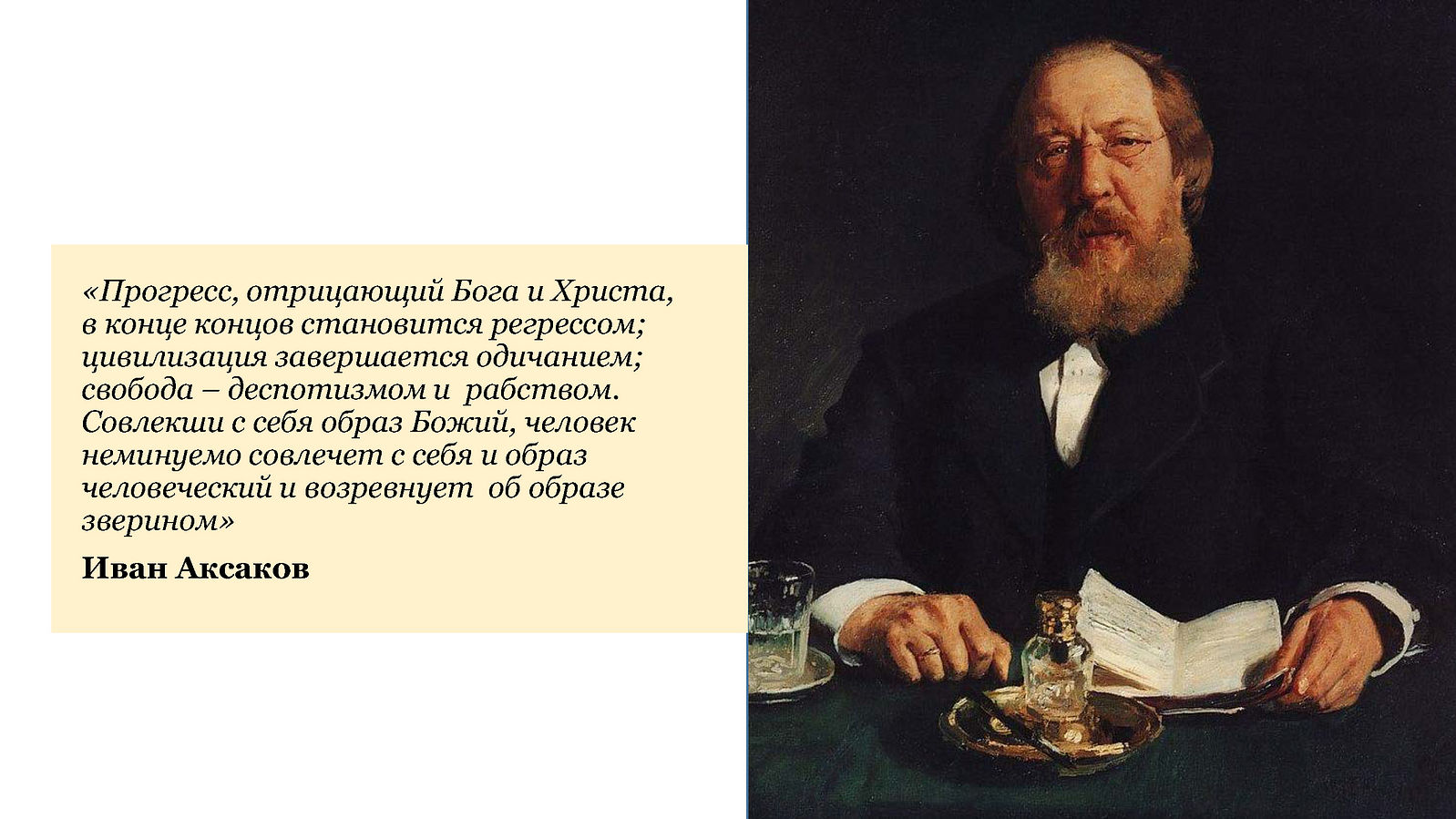 Великий Иван Аксаков сказал: «Прогресс, отрицающий Бога, в конце концов становится регрессом, цивилизация завершается одичанием, свобода – деспотизмом и рабством. Совлекши с себя образ Божий, человек неминуемо совлечет с себя и образ человеческий и возревнует об образе зверином».