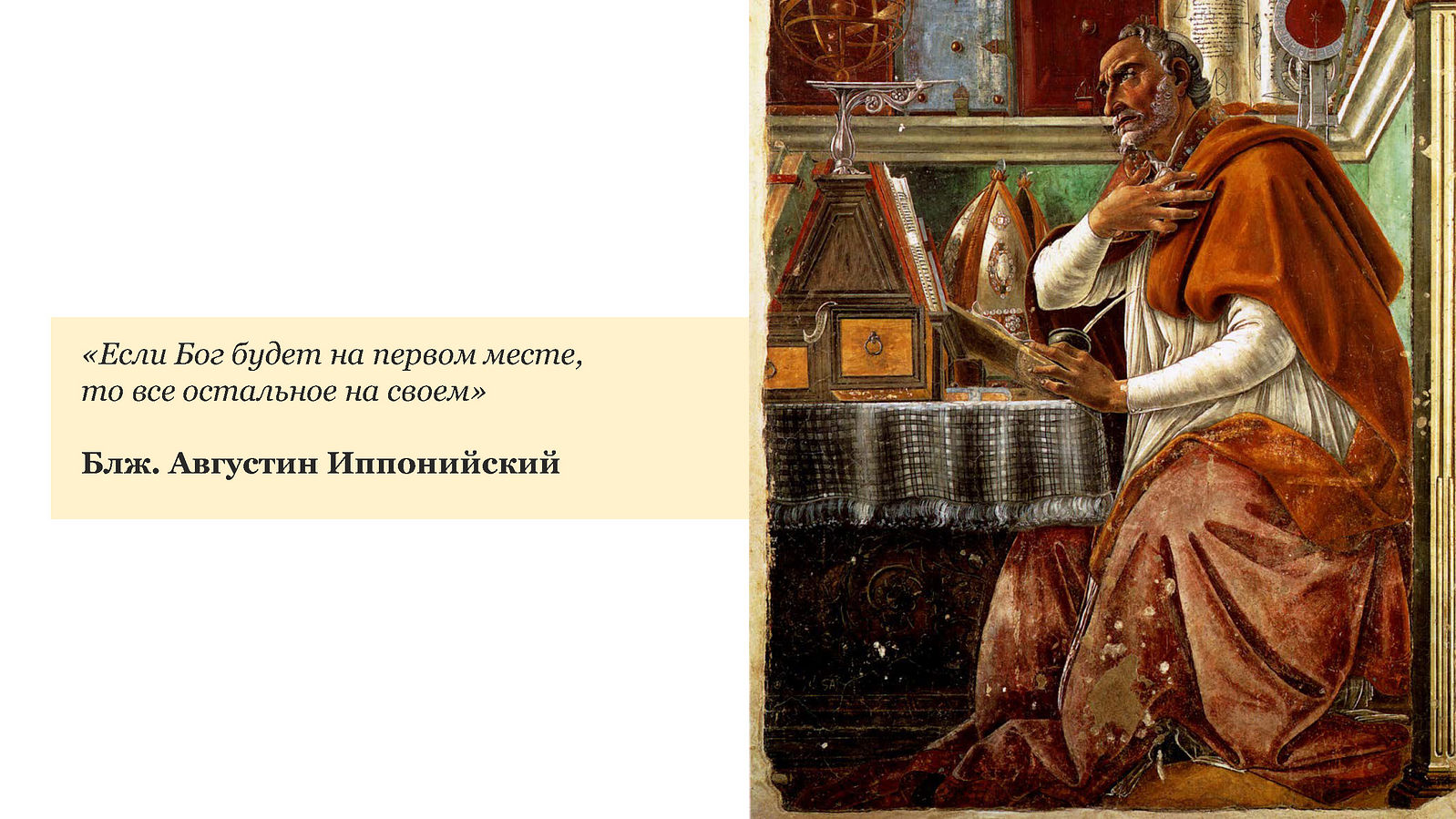 В заключение хотелось бы привести слова блаженного Августина Иппонийского – великого ученого, святого, подвижника, который сам много ошибался в жизни, но тем не менее обрел христианский стержень и смог стать отцом Церкви: «Если Бог будет на первом месте, то все остальное будет на своем».