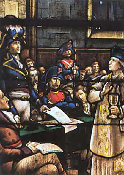 Католический священник Ноэль Пино перед судом французского революционного трибунала. Ноэль Пино отказался принять революционную присягу Конституции и новой власти, продолжал тайно служить мессы и совершать таинства для верных. Был предан одним из прихожан, арестован республиканскими властями и казнён, отказавшись отречься от веры и сана Полученные указы римского первоиерарха начинают сжигаться на кострах, вместе с чучелами, изображающими папу, кардиналов и «неприсягнувших» священников, тогда как «присягнувшие» католические священники и даже епископы щеголяют на улицах французских городов, охваченных революционной страстью, красными «колпаками свободы» и обнимаются с «санкюлотами»…