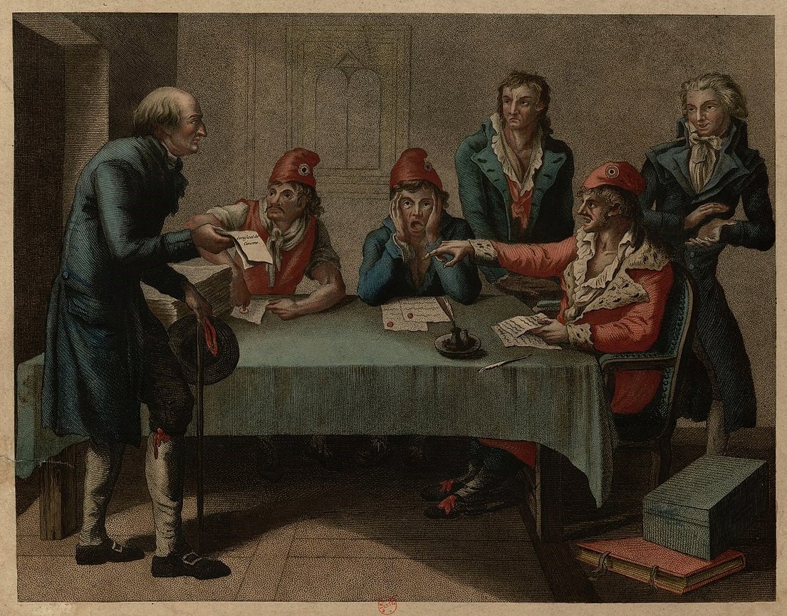 Бывший католический священник, признавший новую республиканскую власть. Французский эстамп, 1790-е гг., из фондов «Bibliotheque nationale de France» Здесь показан бывший католический священник, признавший новую республиканскую власть, отрёкшийся от «тиранических установлений старого режима» и вынужденный ходить в гражданской одежде, который пытается получить «свидетельство о благонадёжности» («Certificat de civisme») в «Революционном следственном комитете» («Les Comites de surveillance revolutionnaire»), в котором заседают безбожники из различных социальных классов. Как тут не вспомнить известные «ревкомы», а также суды «троек» и «пятёрок» советских коммунистов?