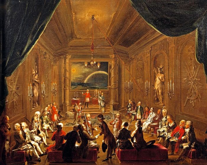 Посвящение неофита в ложе «Новая венценосная надежда» в 1789 г. (как раз год начала «Великой Французской революции»). Художник: Мартин ван Мейтенс Младший На представленном изображении показана церемония внутри масонского храма в XVIII столетии. Судя по статуям античных божеств и иным деталям интерьера, перед нами – типичный языческий храм, вероятно, центр синкретической позднеантичной антихристианской религиозной традиции. Это изображение вполне подкрепляет точку зрения ряда христианских богословов, согласно которой позднеантичное язычество утратило господствующие позиции в европейском обществе благодаря эдиктам таких позднеримских императоров, как Феодосий I Великий и Феодосий II, объявивших нехристианские религиозные культы вне закона. Однако эта, уже, по сути, больше гностическая, т.е. уже с элементами митраизма, иудейской и даже христианской мистики, чем чисто греко-римская античная языческая религиозная традиция больше тысячи лет существовала подпольно в странах христианской Европы и возродилась в виде масонской доктрины в эпоху «Просвещения» в XVII-XVIII вв. Соответственно, можно утверждать, что, продолжая свою многовековую борьбу против христианства, адепты этой языческой религиозно-мистической традиции ставили своей целью ниспровержение христианской Церкви и христианской государственности, и как только они пришли к власти во Франции, то восстановили политику открытых гонений на христиан точно так же, как это происходило и в I-III вв. н.э. в Римской империи, до знаменитого эдикта императора Константина I.