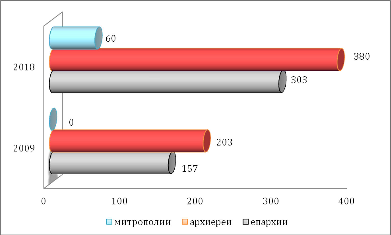 Итак, согласно сведениям, полученным к 1 февраля 2018 года, в Русской Православной Церкви 303 епархии и 60 митрополий[1], 380 архиереев, из них 297 правящих и 83 викарных; 37 799 храмов или иных помещений, в которых совершается Божественная литургия. Эта статистика включает в себя данные по Дальнему Зарубежью и соответствует годовому росту в 921 храм. Штатное духовенство Русской Православной Церкви состоит из 40 447 клириков, включая 35 625 штатных пресвитеров и 4822 диакона.