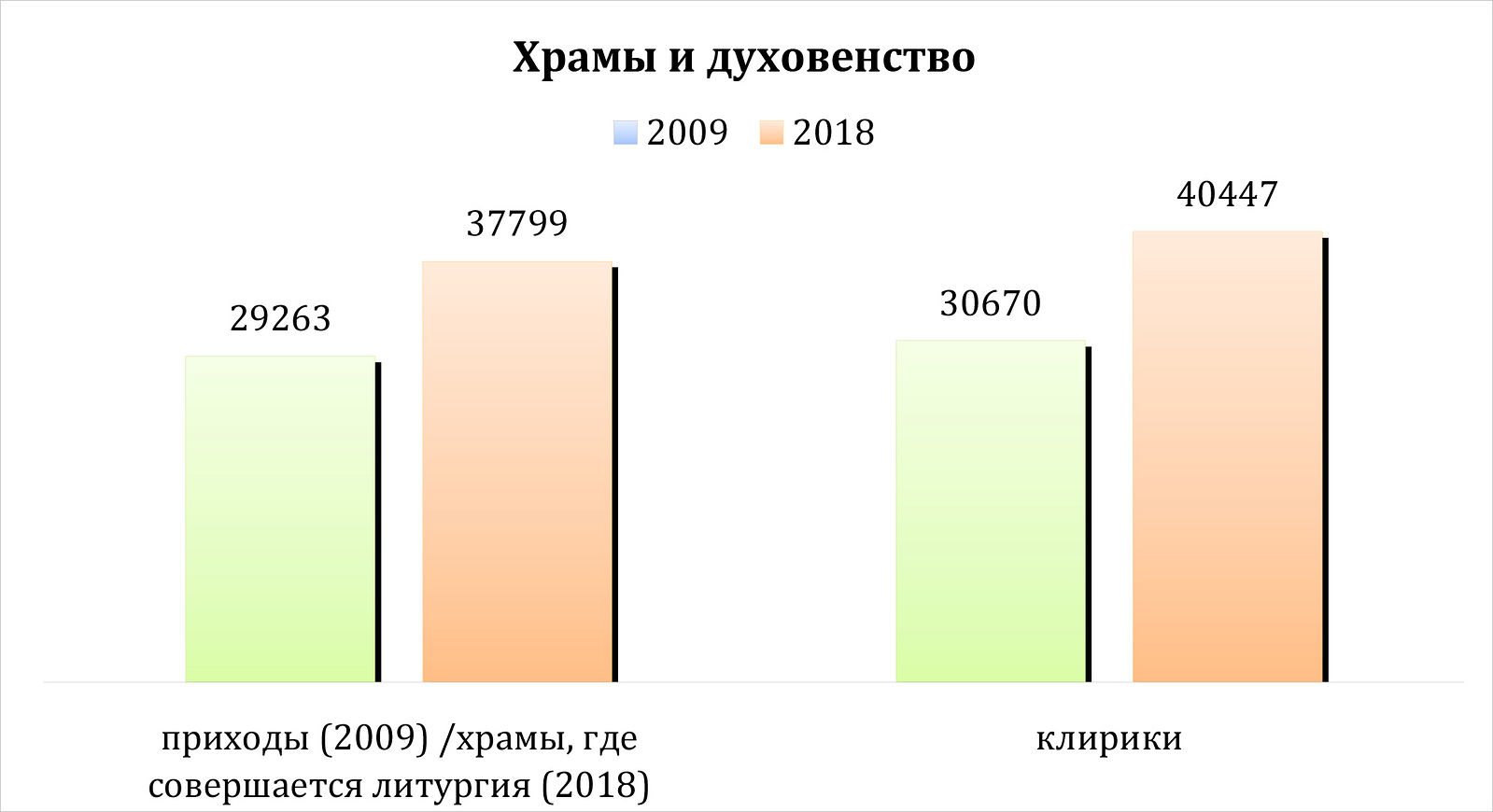 Таким образом, рост количества епархий со времени Поместного Собора 2009 года до 1 февраля 2018 года произошел на 93%, количества архиереев – на 87%, духовенства – на 31%. Храмов, в которых достоверно совершаются Литургии, сегодня 37 799. Сколько их было в 2009 году, неизвестно. Термином «храм» здесь и далее обозначается любое помещение, приспособленное для совершения богослужений (собственно храм, часовня, молитвенный дом, молитвенная комната).