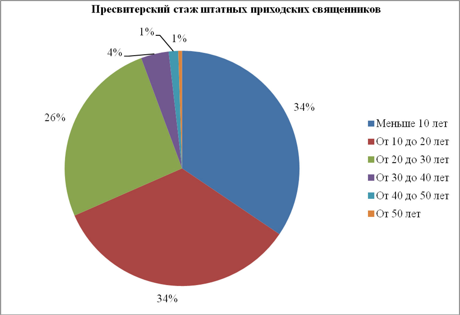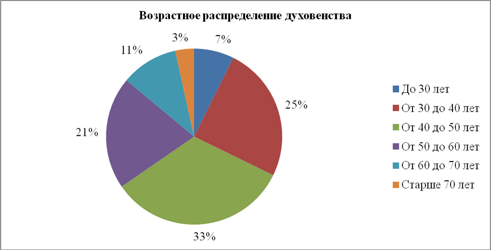 Таким образом, мы видим, что сегодня среди пастырей больше всего лиц в возрасте от 30 до 60 лет (79%). При этом в сане они могут быть как менее 10 лет, так и больше, вплоть до 30 лет.