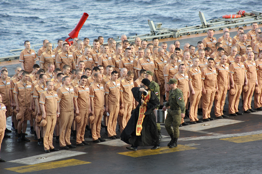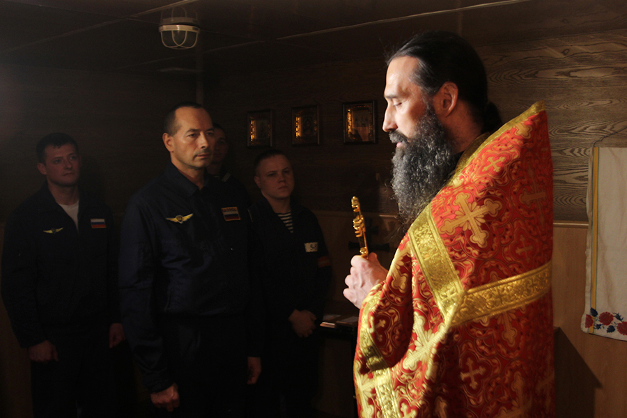 На авианесущем крейсере билось духовное его сердце – совершалась молитва, служилась Божественная Литургия, действовал Божий храм Воинский подвиг может быть разным. Может быть ярким и понятным – когда кто-то бросается на амбразуру, взрывает себя и врагов гранатой, вызывает огонь на себя. Но может быть и не таким ярким, но не менее значимым – когда воин просто изо дня в день выполняет свои обязанности, стоит на посту, претерпевает стеснения и трудности разного рода – и душевные, и телесные. Наш Подвигоположник Христос учит нас подвигу и вдохновляет на него. И претворяет горечь труда в сладость и радость подвига.