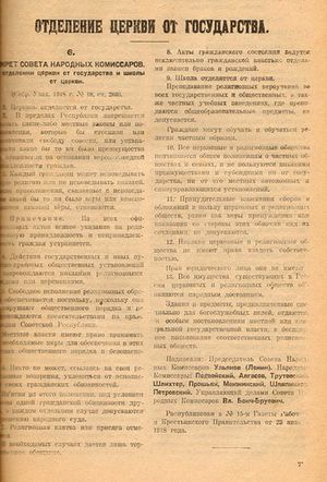 Совнарком утвердил окончательный текст документа. Под этим актом поставили подписи члены правительства во главе со своим председателем: Ленин, Подвойский, Алгасов, Трутовский, Шлихтер, Прошьян, Менжинский, Шляпников, Петровский и управляющий делами Совнаркома Бонч-Бруевич. 21 января декрет был напечатан в газетах «Правда» и «Известия», а два дня спустя, 23 января, был опубликован официальным органом Совнаркома «Газетой Рабочего и крестьянского правительства». Это число и принято считать датой издания декрета, а вот окончательную редакцию своего наименования он получил несколько позже – 26 января, когда он вышел в 18-м выпуске «Собрания узаконений РСФСР» с названием «Об отделении церкви от государства и школы от церкви», воспроизводящим текст первой и последней статьи документа.