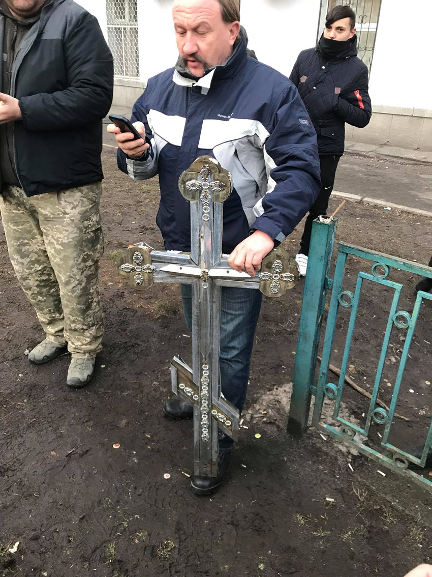 «Штуковина, похожая на христианский крест, которая была закреплена на самозахваченном стволе, упала от ветра перемен. Община Киева, националисты и просто неравнодушные не дадут незаконно застраивать Киев и сносить памятники», – написал на своей странице в Фейсбук представитель так называемых «Национальных дружин» Сергей Никитин.