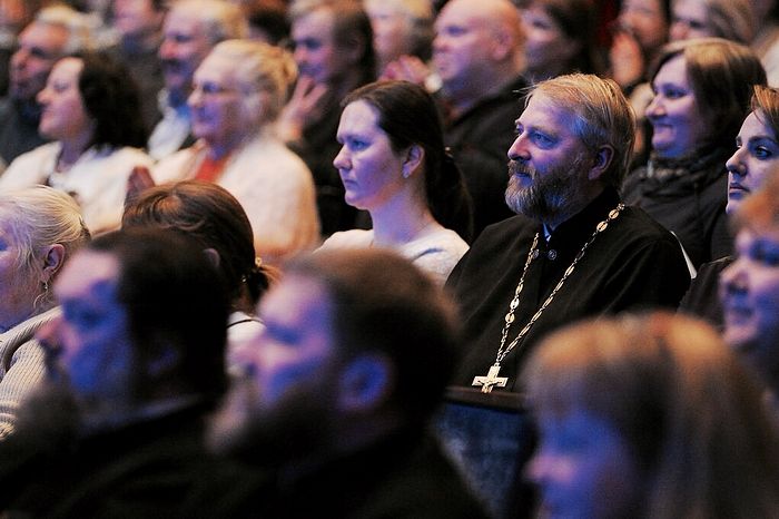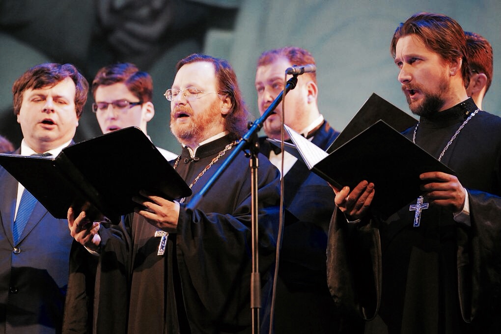 Конечно, в программе были не только шуточные и развлекательные, но и серьезные номера. В исполнении хора духовенства Санкт-Петербургской митрополии под управлением Юрия Герасимова прозвучали произведения композиторов Георгия Свиридова "Любовь святая", Александра Глазунова "Песнь учеников Иисусовых", Леонида Афанасьева "Гляжу в озера синие" и русская народная песня "Взвейтесь, соколы, орлами".