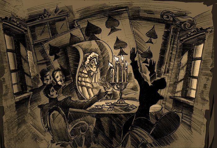 Во-первых, отметим, что «Пиковая дама» посвящена игре как способу бытия. В какой-то момент весь мир для главного героя повести становится колодой карт: