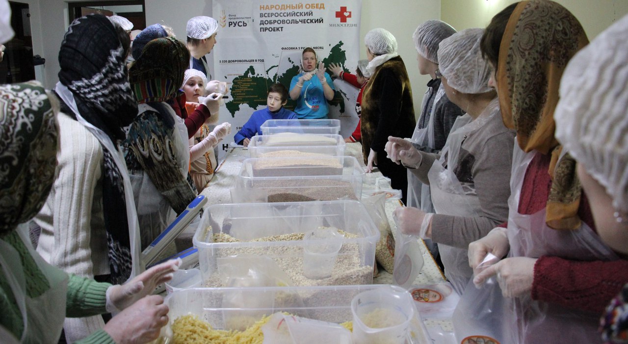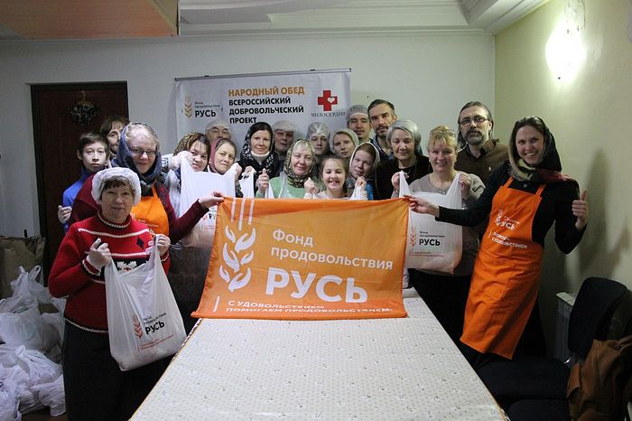 «Народный обед» - проект запущенный в 2013 г. Фондом продовольствия «Русь» совместно с православной службой «Милосердие». В рамках проекта малоимущие люди по всей стране получают продуктовые наборы, содержащие 5 различных круп и подсолнечное масло. В фасовках принимают участие добровольцы, персонал крупных компаний и известные люди.