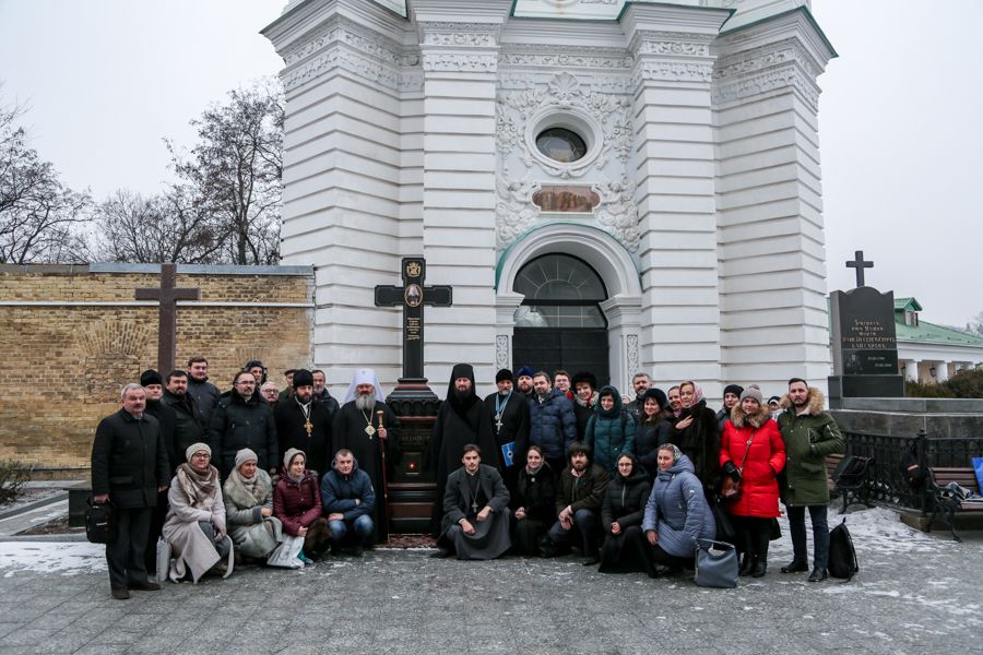На память о сотрудничестве и проведенных днях в святой обители было сделано общее фото у могилы почившего Предстоятеля УПЦ Митрополита Владимира (Сабодана).