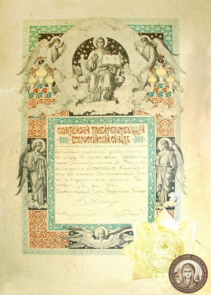 Синодальная Грамота за подписью Митр. Владимира (Богоявленского) от 30 сентября 1914 г. о награждении игумена Ильинского скита на Афоне архимандрита Максима (+ 11 июня 1919 г.). Фото Сергея Шумило, Афон, октябрь 2017 г. Также представлены письма митрополита Владимира (Богоявленского) игумену Русского на Афоне Свято-Пантелеимонова монастыря схиархимандриту Мисаилу (Сапегину, 1852 - 1940) за 1912 – 1914 гг.