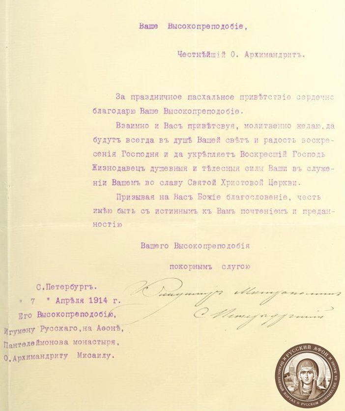 Письмо митрополита Владимира (Богоявленского) игумену Русского на Афоне Свято-Пантелеимонова монастыря схиархимандриту Мисаилу (Сапегину, 1852 - 1940) за 1913 г. Фото Сергея Шумило По словам директора Международного института афонского наследия Сергея Шумило, «эти письма, ранее нигде еще не публиковавшиеся, являются ценным свидетельством имевшихся связей свщмч. Владимира (Богоявленского) с Пантелеимоновым монастырем и Ильинским скитом на Афоне. Также на выставке нами впервые представлена редкая фотография, на которой запечатлено, как мон. Серафим из Пантелеимонова монастыря на Афоне на печатной машинке 31 августа 1913 г. набирает ответ митрополиту Владимиру, а перед ним на столе в рамке стоит Синодальная Грамота за подписью будущего священномученика».