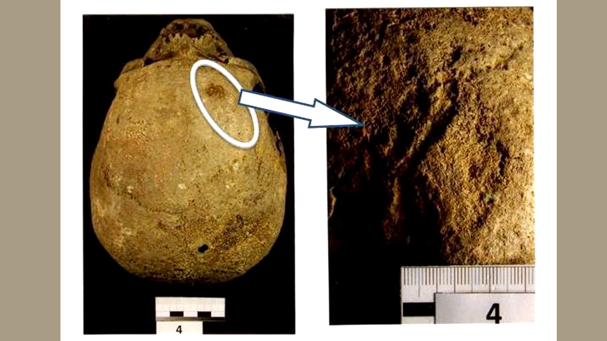 В дополнение к этому мы сделали рентгенографию с прямым увеличением изображения, которая позволяет сделать рентген небольшого участка с очень высоким разрешением снимка. Мы увеличили этот участок черепа №4 примерно в 50 раз и, проследив структуру костной ткани, подтвердили результаты компьютерной томографии. С уверенностью можно сказать, что это вполне могут быть следы двух ударов рубящим предметом.