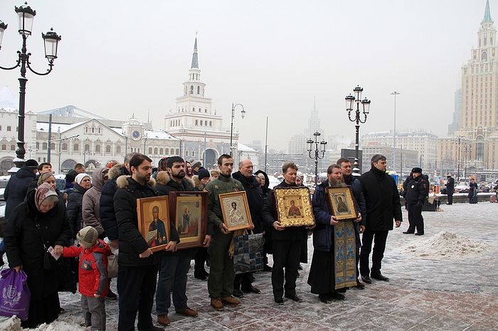 Молитвенное шествие с чудотворной мироточивой иконой Божией Матери «Умягчение злых сердец», мироточивой иконой Божией Матери «Умягчение злых сердец» Донецкая, иконой великомученика Пантелеимона, иконой святой равноапостольной Нины и иконой святого праведного Феодора Ушакова началось с молебна в часовне Казанской иконы Божией Матери на Казанском вокзале.