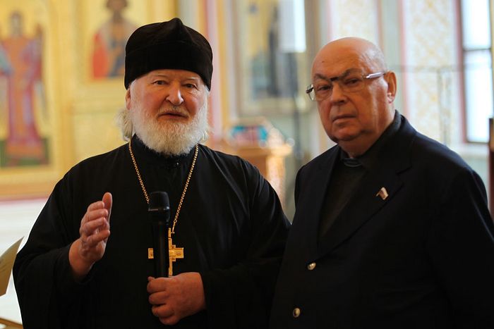 Потом обсуждали проблемы сохранения исторического наследия в храме Христа Спасителя, построенном в наши дни взамен взорванного. В Новодевичьем монастыре, к счастью, можно было посмотреть, как идет реставрация этого памятника истории и культуры, охраняемого ЮНЕСКО. И вот - новая встреча. На сей раз - в Московском епархиальном доме, где депутат Госдумы Владимир Ресин встретил нас с отцом Владимиром (Воробьёвым), ректором расположенного здесь Православного Свято-Тихоновского гуманитарного университета, которому, как хозяину, и был адресован наш первый вопрос.