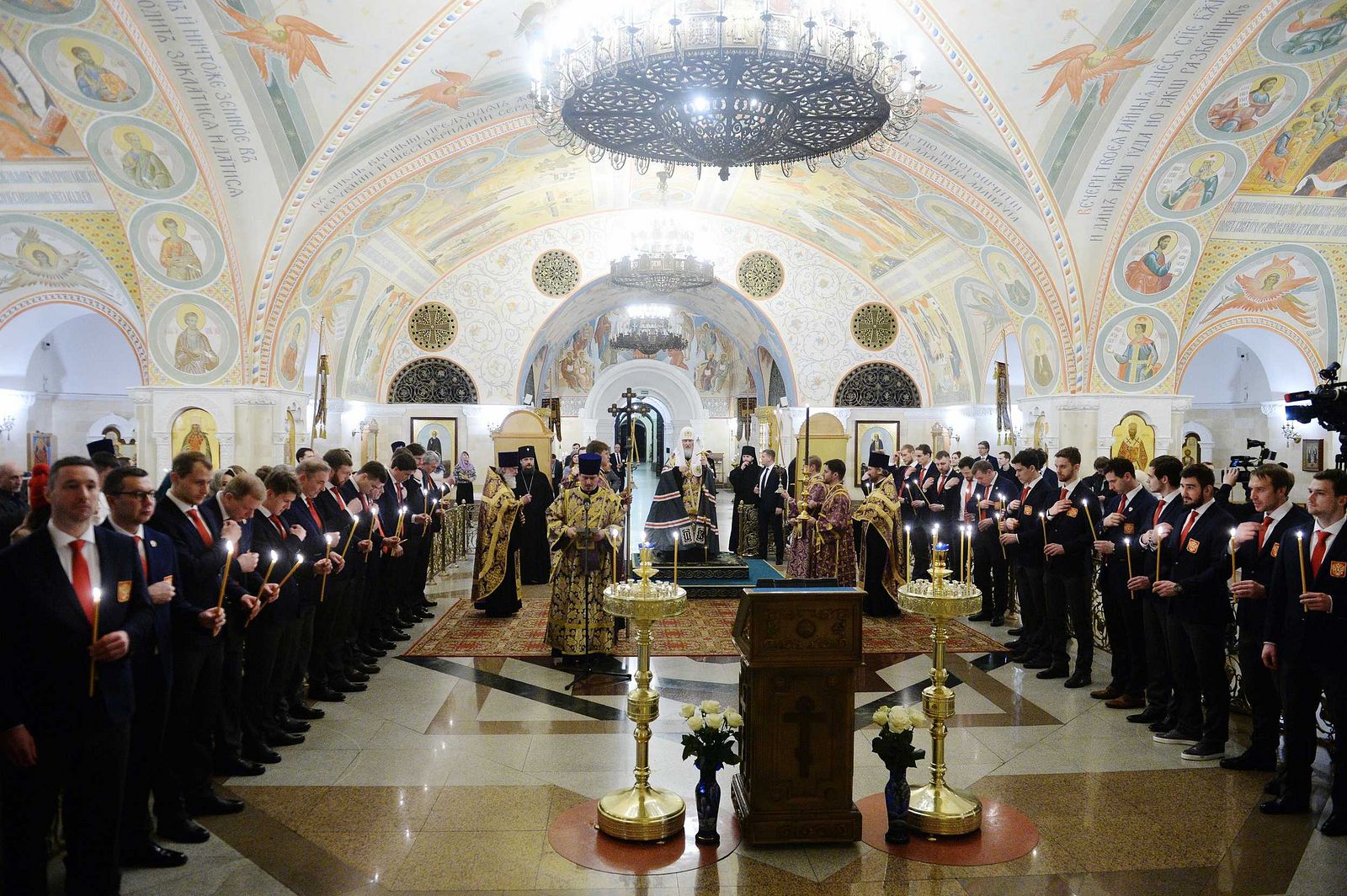 На богослужении присутствовали: А.Д. Жуков, первый заместитель Председателя Государственной Думы Федерального Собрания Российской Федерации, президент Олимпийского комитета России; игроки хоккейной сборной. Мужская сборная России по хоккею завоевала золотые медали Олимпийских игр, обыграв в финале команду Германии.