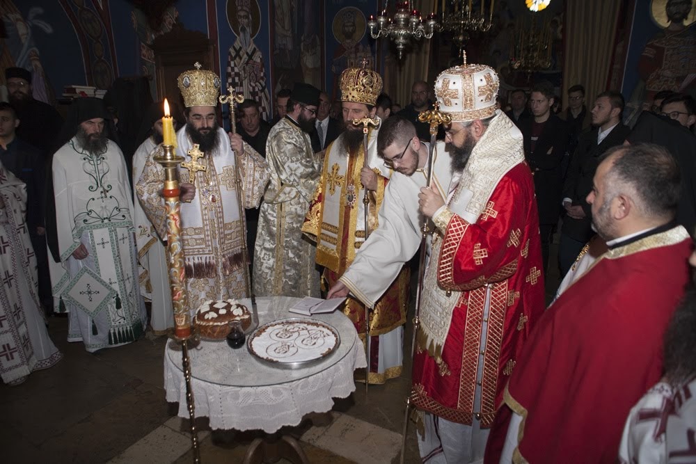 Литургији је присуствовао велики број свештенства из разних епархија наше Цркве, верујући народ, професори и помоћно особље наше богословије која је тога дана обележавала своју крсну славу. Током Литургије присутни су имали могућност да чују благе речи Јеванђеља о томе да „Не може се град сакрити када на гори стоји, нити се ужиже светиљка и меће под суд него на свећњак те светли свима који су у кући.“ (Мт 5;14-15). Тако Господ ова три светила тросунчаног божанства не сакри од нас већ их показа и даде нама као пример, а наша школа је добила и ту част да буду посредници и васпитачи у страху Божијем свима онима који је похађају.