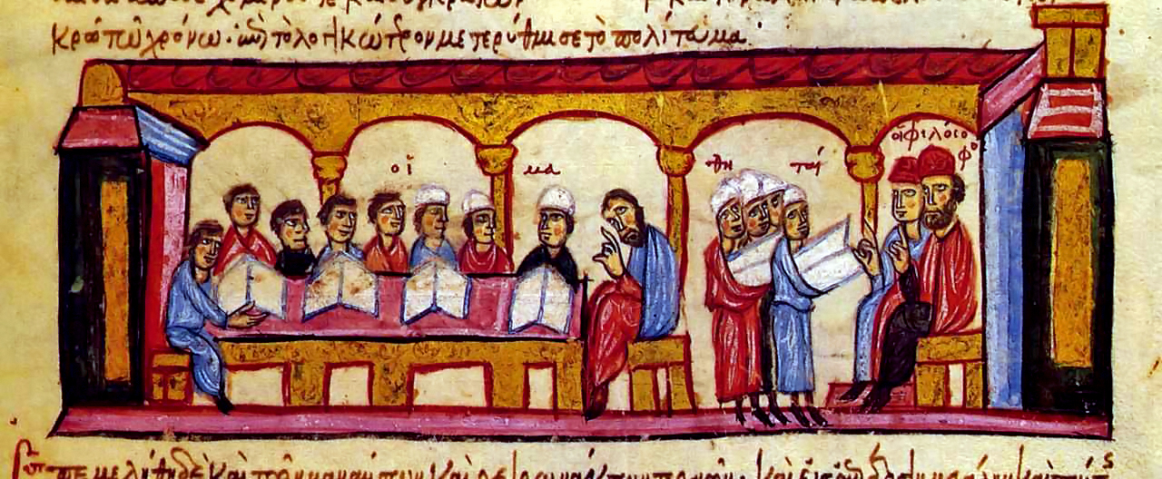 Кстати, тут стоит особо отметить, что греческий язык, изучавшийся в школах Византии, не был «родной речью» учеников – это был классический древний язык, язык античных авторов, в том числе Гомера и неаттических (писавших на отличных от аттического диалектах) классиков, весьма малопонятный необразованным слоям населения. Неслучайно в Византии церкви и монастыри фактически брали на себя задачу сохранения не только христианской, но и эллинской языческой книжности.