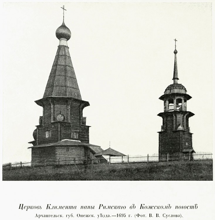 Храм священномученика Климента, папы Римского. Деревня Уна, Архангельская область, 1501 г. В.В.Суслов. 80-е гг. XIX в. Распространившись на Руси, традиция почитания святого Климента на Русском Севере шла из Новгорода, где в ΧΙΙ веке стоял храм, посвящённый святому. Почитание святого Климениа распространилось и в подчиненных Новгороду землях. Житие священномученика, связанное с морем, было близко поморам, живущих морской стихией.