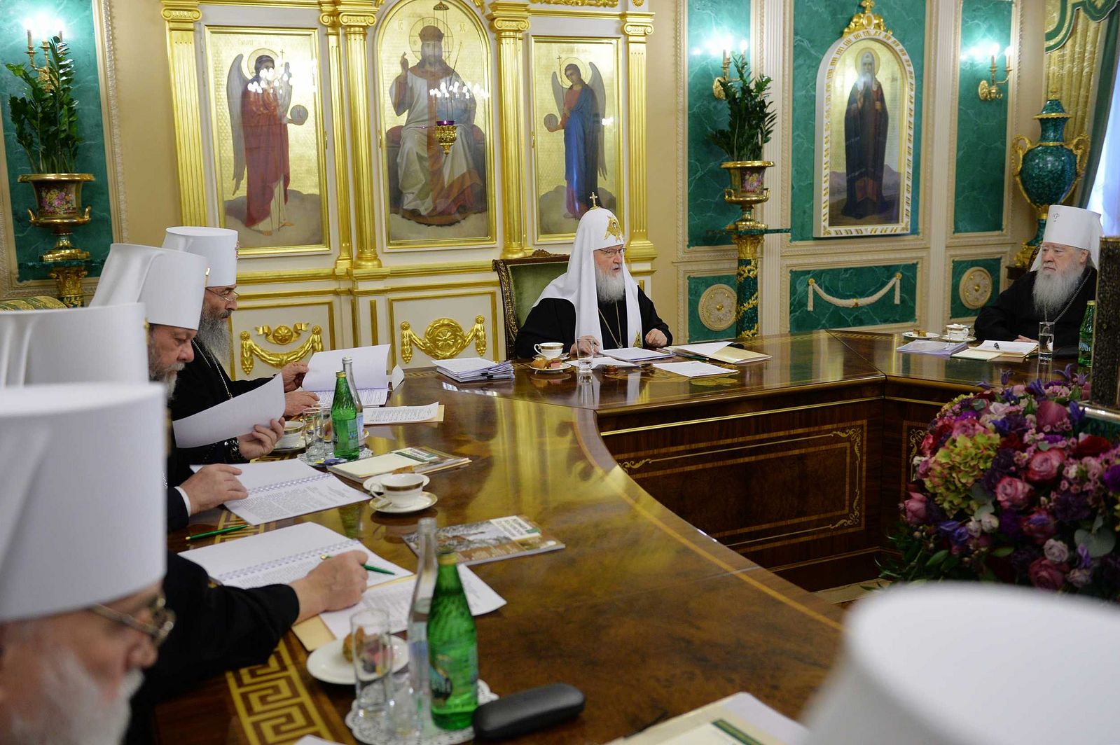 Открывая заседание, Предстоятель Русской Православной Церкви приветствовал постоянных и временных членов Священного Синода.
