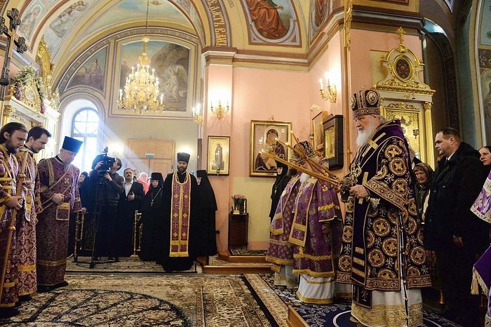 По прибытии в обитель Святейший Патриарх Кирилл поклонился честным мощам блаженной старицы, почивающим в Покровском храме, а затем в храме Воскресения Словущего совершил вечерню и Литургию Преждеосвященных Даров.