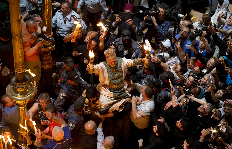 Священнослужитель Армянской апостольской церкви Агоян накануне заявил израильским СМИ, что наблюдал, как зажигают связки восковых свечей от масляной лампады в Храме Гроба Господня.