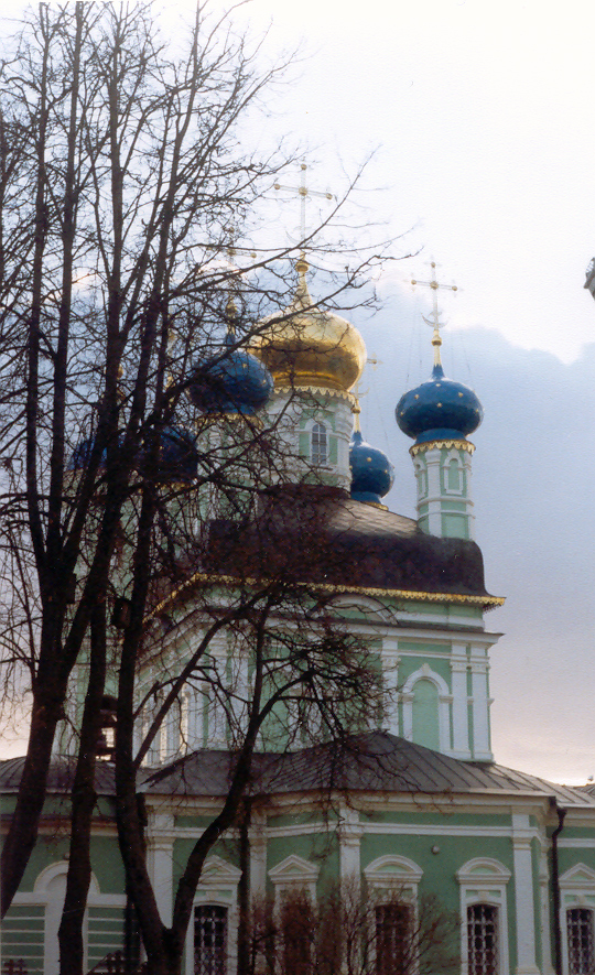 Несомненно, мы пребывали в некоторой растерянности от близости святыни. Сто метров – до ограды монастыря, над которой плыли в меняющейся облачности (когда небо не «тупое», белесо-голубое, а облачное, это всегда – красиво и «содержательно») купола и деревья Оптиной. Тучи разной насыщенности, от белых к чёрным, проносились весьма быстро, что отсылало к мыслям о беге времени, о связанности времён, о единстве всего со всем. Простояв в таком состоянии созерцания неба даже одну минуту, можно увериться, что пролетели эпохи.