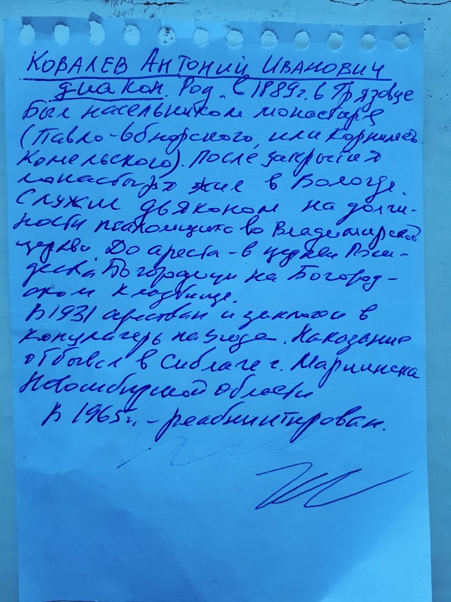 Из записки ясно, что после закрытия монастыря в Грязовецком уезде и изгнания оттуда иноков монах Антоний жил в Вологде. Денег на жизнь не было, образования, кроме духовного, нет, да и как без молитвы жить? В 1920-х годах он стал служить в одной из красивейших и известных церквей Вологды, каким был тогда еще не разоренный храм в честь Владимирской иконы Божией Матери.