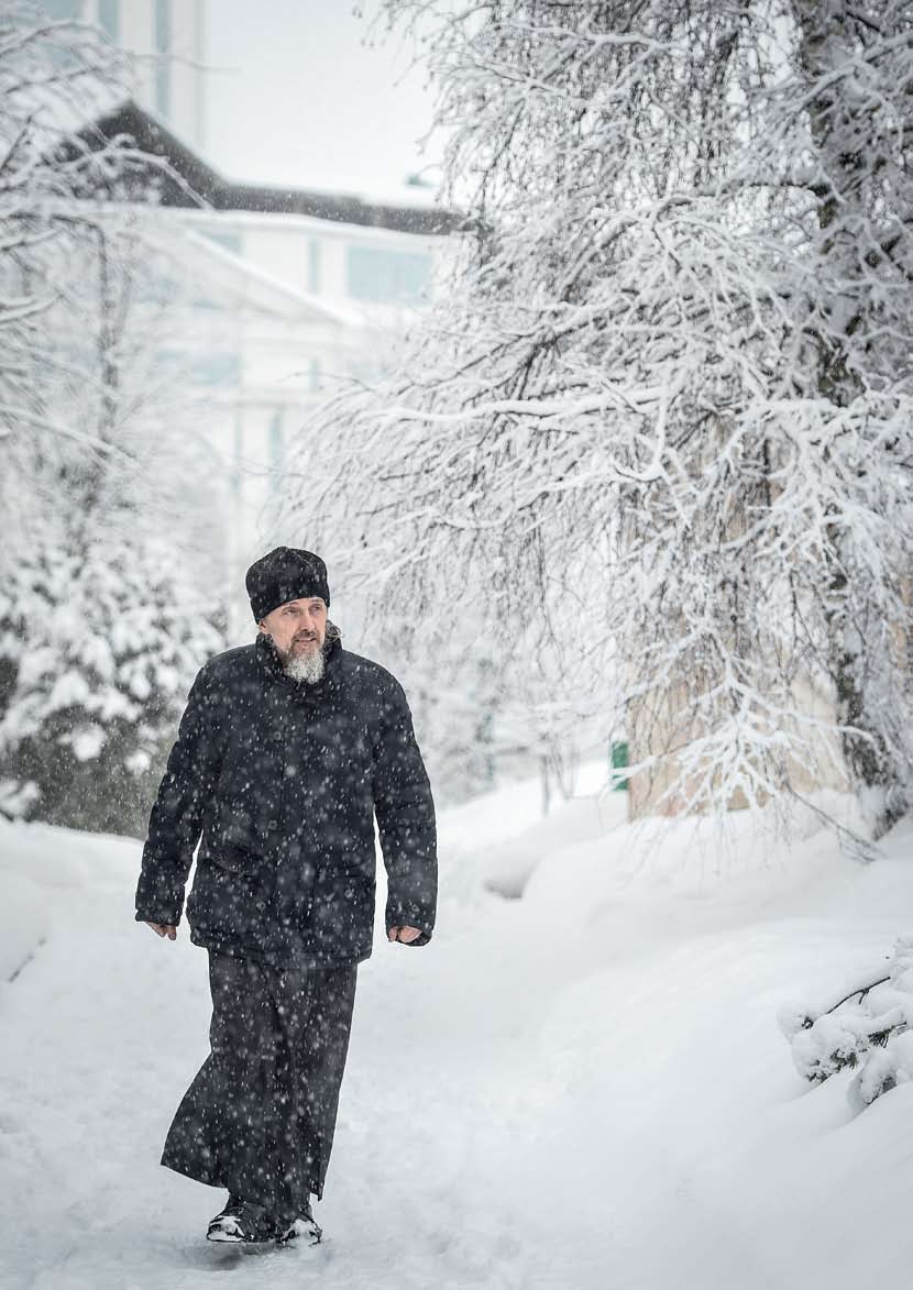 Сотрудник монастыря Дмитрий встретил нас у Троицкого собора и проводил в кабинет иеромонаха Моисея, что в келейном корпусе напротив Успенского собора, рядом с колокольней. Как офтальмолог отец Моисей пациентов принимает в другом месте – в здании монастырской аптеки за пределами монастыря. Туда мы тоже в тот день дошли. Правда, с трудом – продираясь через стремительно нарастающие сугробы. Но обо всем по порядку.