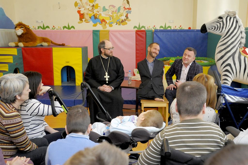 В игровом зале Детского хосписа, где обычно разбросаны игрушки и на экране идут мультфильмы, собрались пациенты Детского хосписа и их родные. Ник был готов ответить на любые вопросы. В ответ на вопрос, где искать силы жить, когда сил уже нет, Ник сказал: «Любовь - самая мощная сила в мире. Когда мы помогаем кому-то, не ожидая благодарности, или любим кого-то, кто даже не может поблагодарить вас в ответ, то это на самом деле безусловная любовь. Человек может не замечать этой любви в круговерти своей жизни. Когда вы не получаете чудо, вы всегда можете сотворить чудо для другого или быть для кого-то этим чудом».